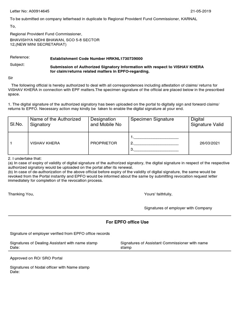 After that you will be authorized to forward transfer claims online. We the _____company name writing this letter regarding the name correction of one of our employees _____employee name of UAN _____ and PF member ID _____. The EPFO office will approve the Digital Signature Certificate DSC on the basis of signature available in EPFO office.